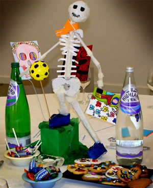 strip lights, three large screens along one wall and around a dozen round tables decorated with homemade sculptures modeled on those familiar images of hollowed eye sockets and gaping jaw lines – there are bowls of sweets and plates of biscuits with similar blood dripping themes.Â