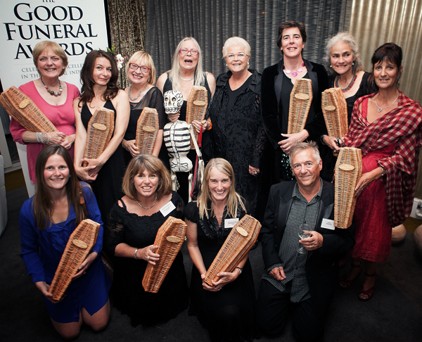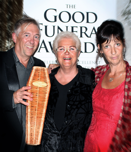 Hmmm… Strange trophy perhaps – a minature wicker coffin but given that the event is organised by THE GOOD FUNERAL GUIDE hardly surprising – and its bigger than an Oscar (and lighter than my Bafta!)   In effect The Good Funeral Awards are the annual shindig of what we have come to know as the “deathies’.   In attendance were the great and the good from the world of funeral directors, celebrants, bereavement counsellors, coffin builders and grave diggers – as well as Pam St Clement (whose on screen death as Pat Butcher in East Enders has clearly touched many a heart) was there to dish out the prizes.