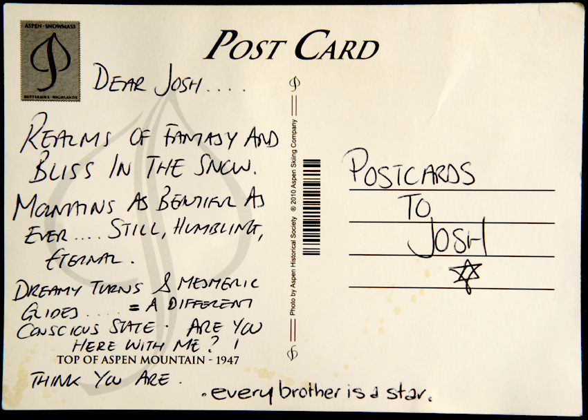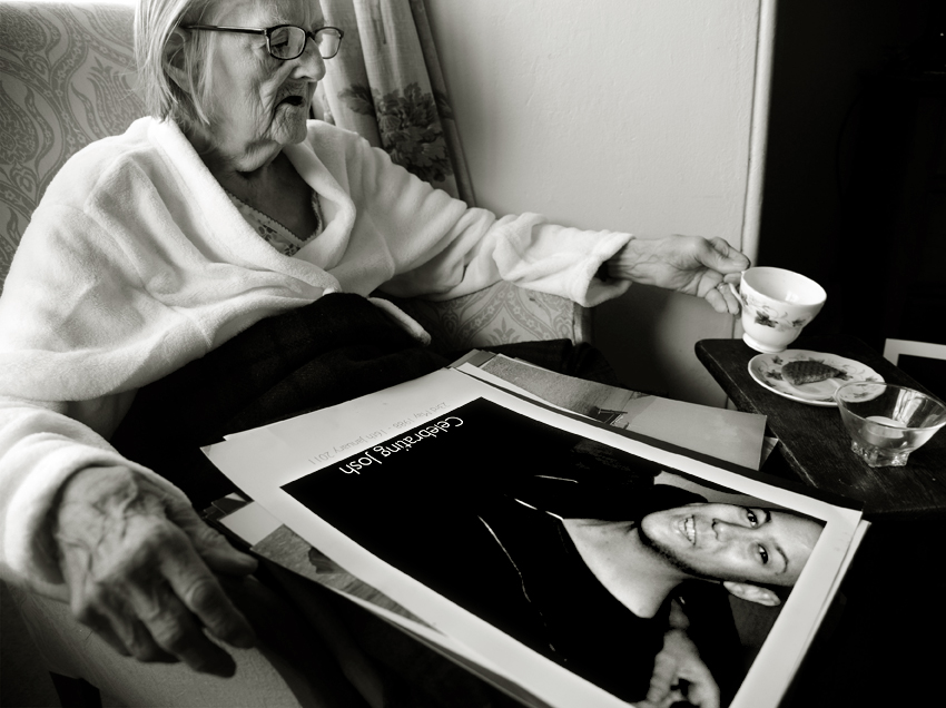 I light the candle.  That’s not very big is it?  What kind of candle is that?  It’s true, it’s a small tee light in a glass saucer and the wick is too short to hold a decent flame.  I feel a bit awkward trying to remember Josh with so little means at my disposal. I go back to the beginning.  It’s for Josh, Mum, he died three years ago and I’ve brought some things to help us remember him.  Why?  Have you forgotten what he looks like?  She studies the photo we used for his funeral with the graphic “Celebrating Josh”.  What’s there to celebrate – he’s dead isn’t he?  You don’t celebrate when someone dies.  Well we did, Mum. How do I explain this?  She was there three years ago at his funeral, at what we then called a celebration of his life, a two day event created out of the deepest sadness but with the hope of finding some residue of joy.  (we have two films on this site that record Josh’s funeral)