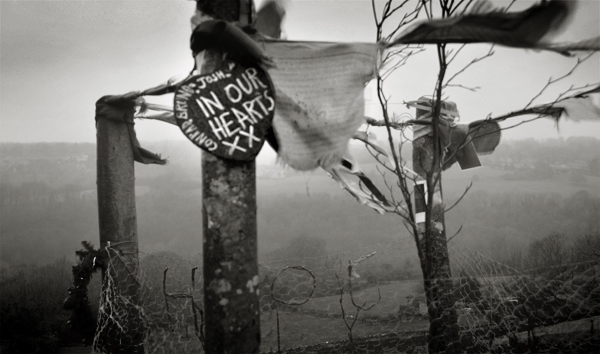Jane and I have just downed a scotch each at the pub where Josh used to work and are walking along the track that leads to his tree.  Its a pilgrimage we have made many times now – three years of tending to our boy’s grave, three years of arranging flowers and of pinning up flags, three years of doing what we should never have to do.  The land rises in front of us and as we walk the view across the valley broadens revealing our village in the distance … as well as a build up of dense cloud. We make it to the nearby barn just in time as a wall of rain sweeps across the fields.   Our plans to spend some time at the tree are for the time delayed by another onslaught of January weather.