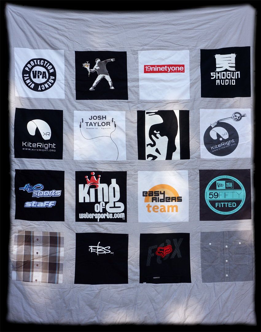 A friend who I first met when Josh and her son started school together came to visit a few months after Josh’s death. At the time she and her family were living in China but were soon going to be moving to the United States. She told me that she had recently had memory quilts made up for her young daughters, made from clothing that represented her daughters’ years in China, i.e. T shirts from events, clubs, schools, etc. and asked if it was something we might consider doing with some of Josh’s clothing. We had to decide fairly quickly as it would be made in China and she was only going to be there for another few months. She showed us photos of one her daughter’s quilts which we thought looked amazing and it seemed such a positive thing to do with Josh’s clothes.