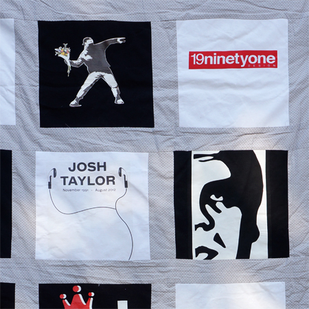 We come to know about Josh Taylor’s death via Lewis Murphy, the first successful candidate of the Josh Edmonds Memorial scheme.  Lewis was one of Josh Taylor’s best friends, a fact not known to us when he applied for the scheme and a chance to work as an intern at the Ministry of Sound where our Josh had been a video producer.   A strange irony then that Lewis should find himself benefitting from two music loving Josh’s unable themselves to fulfill their ambitions, while we have had the chance to meet and become friends with his friends parents.   As we have got to know Debbie and Nick Taylor, we’ve shared our stories and our sorrows and our different ways of remembering our children and of taking them forward with us  in our lives.   The quilt is just one of the ways Josh’s family have of continuing that bond they have with him as  Debbie explains : …..