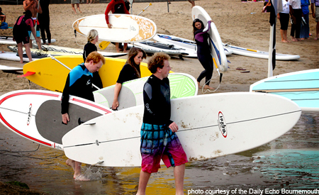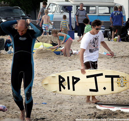 As a tribute to Josh, at 5pm on the afternoon of his funeral his friends took their surf boards to Branksome Chine beach for a “paddle-out”, where they formed a circle of boards in the surf. Josh’s Dad Nick and brother Joe also joined them and Nick said a few words in memory of Josh after which flowers were scattered within the circle. The rest of the evening was spent at Branksome Chine beach bar where more of Josh’s friends gathered to pay tribute to him with some of his favourite drum & base tunes. Josh was also a local drum & base DJ known as ‘Grafik’.